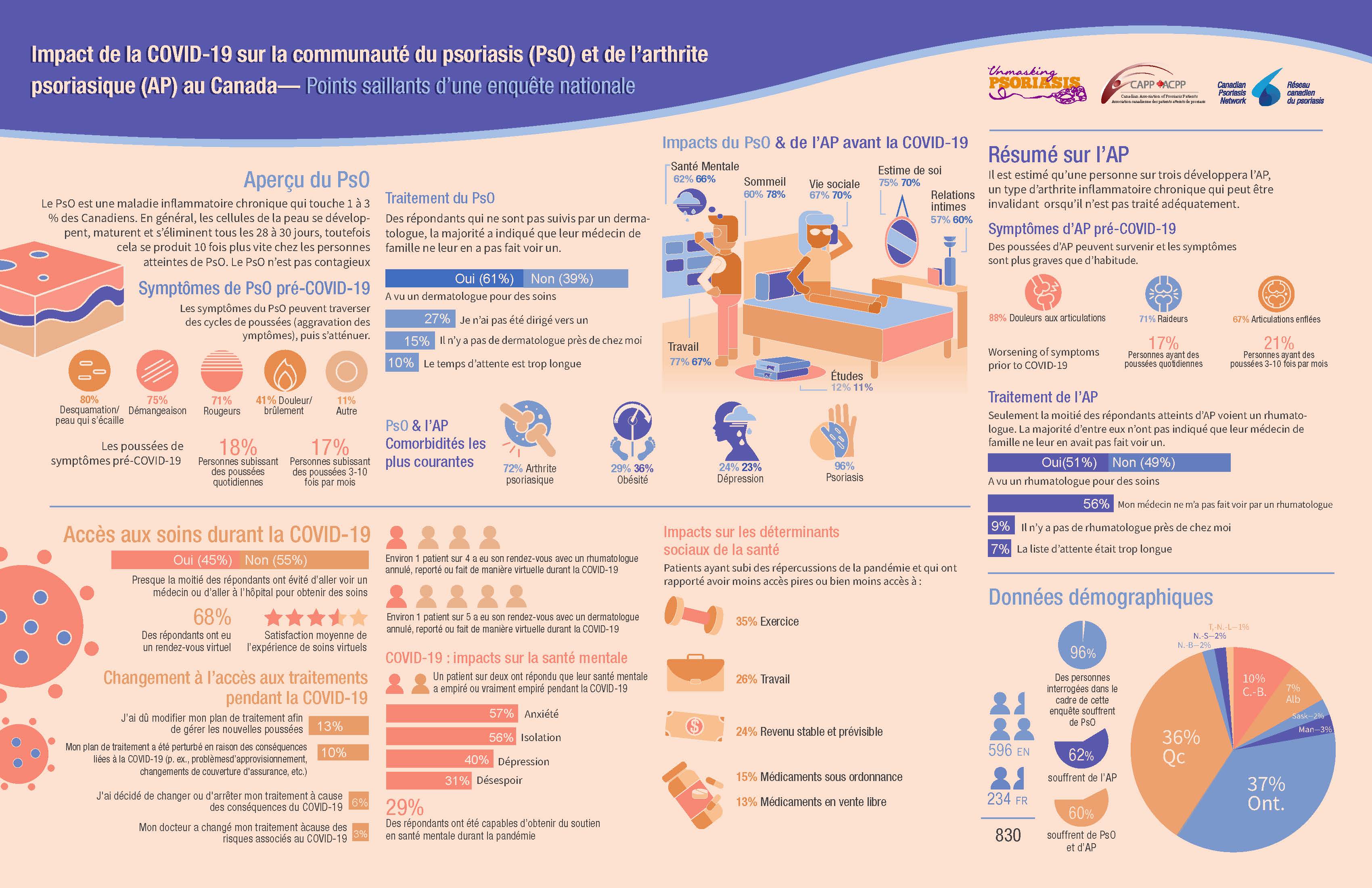 En cette Journée mondiale du psoriasis, le RCP unit ses efforts à ceux de I’Association canadienne des patients atteints de psoriasis et de Unmasking Psoriasis, un groupe de sensibilisation de la Saskatchewan, afin de mieux faire connaître et faire comprendre le psoriasis. Consultez ce document de synthèse qui présente les faits saillants d’une enquête nationale menée auprès de 830 personnes atteintes de psoriasis et d’arthrite psoriasique au Canada, notamment quant à leur expérience dans le cadre de la pandémie. Merci à notre vibrante communauté du psoriasis d’avoir répondu au sondage, d’avoir partagé vos histoires avec nous et d’avoir contribué à sensibiliser les gens et à lutter contre la stigmatisation associée au psoriasis lors de la Journée mondiale du psoriasis et tout au long de l’année !