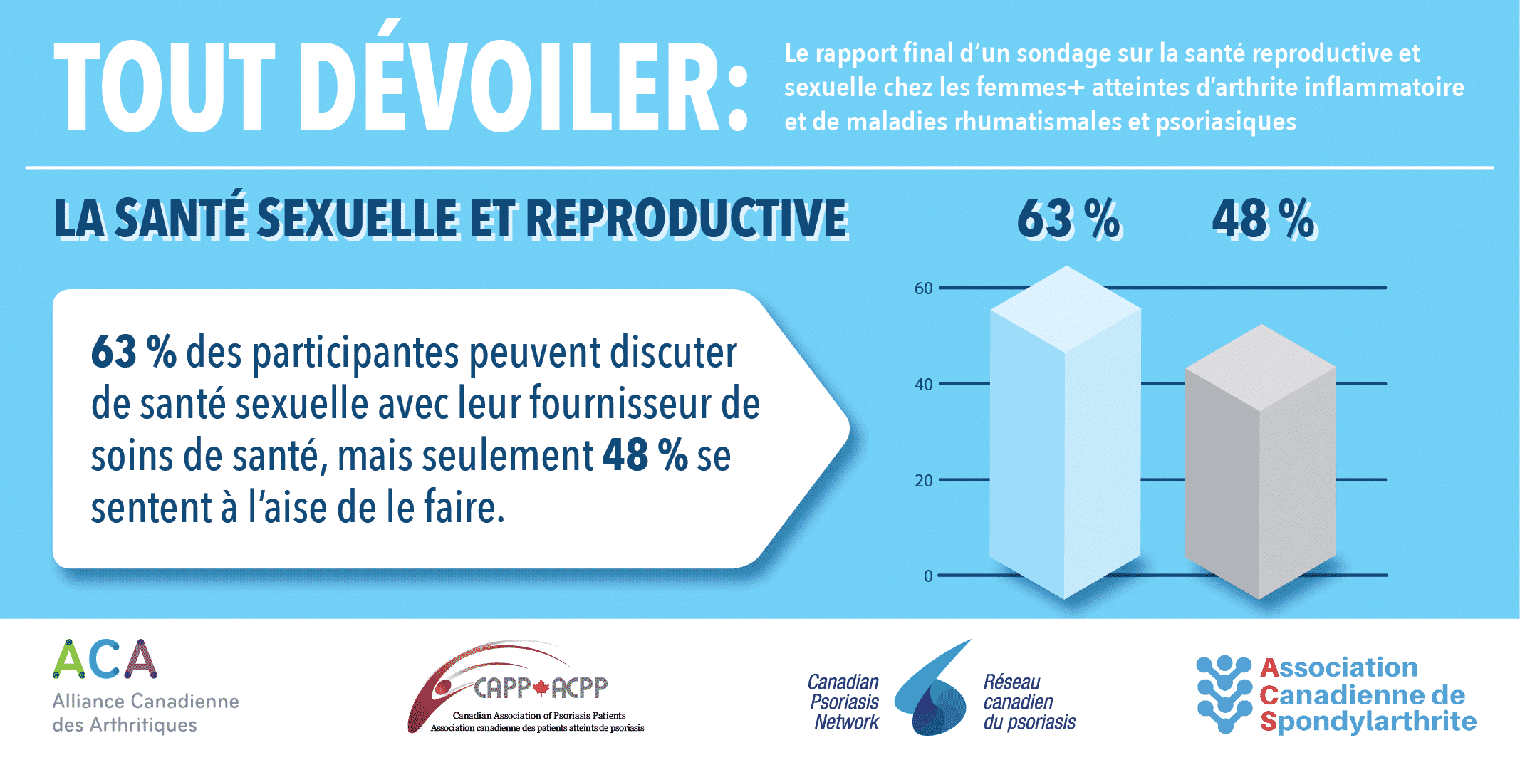Les points saillants de Tout dévoiler : le rapport final d’un sondage sur la santé reproductive et sexuelle chez les femmes+ atteintes d’arthrite inflammatoire et de maladies rhumatismales et psoriasiques.